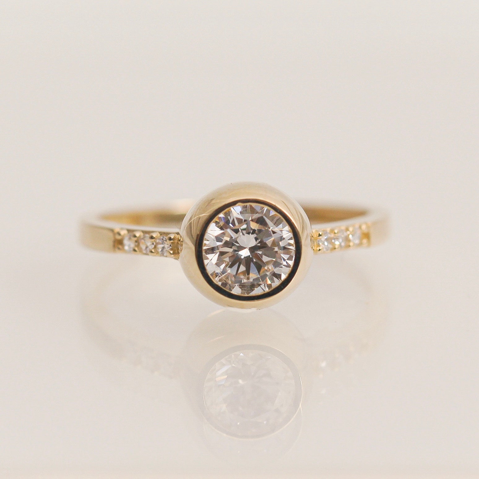 A timeless symbol of elegance, the Entourage design of this Solitaire Ring White Stone Ring is a true masterpiece. The round cut center stone is surrounded by a halo of sparkling accents, creating a mesmerizing aura of beauty and sophistication. Made from 14K solid gold, this ring is available in your choice of 14K yellow, pink, or white gold, ensuring a perfect match to your personal style.