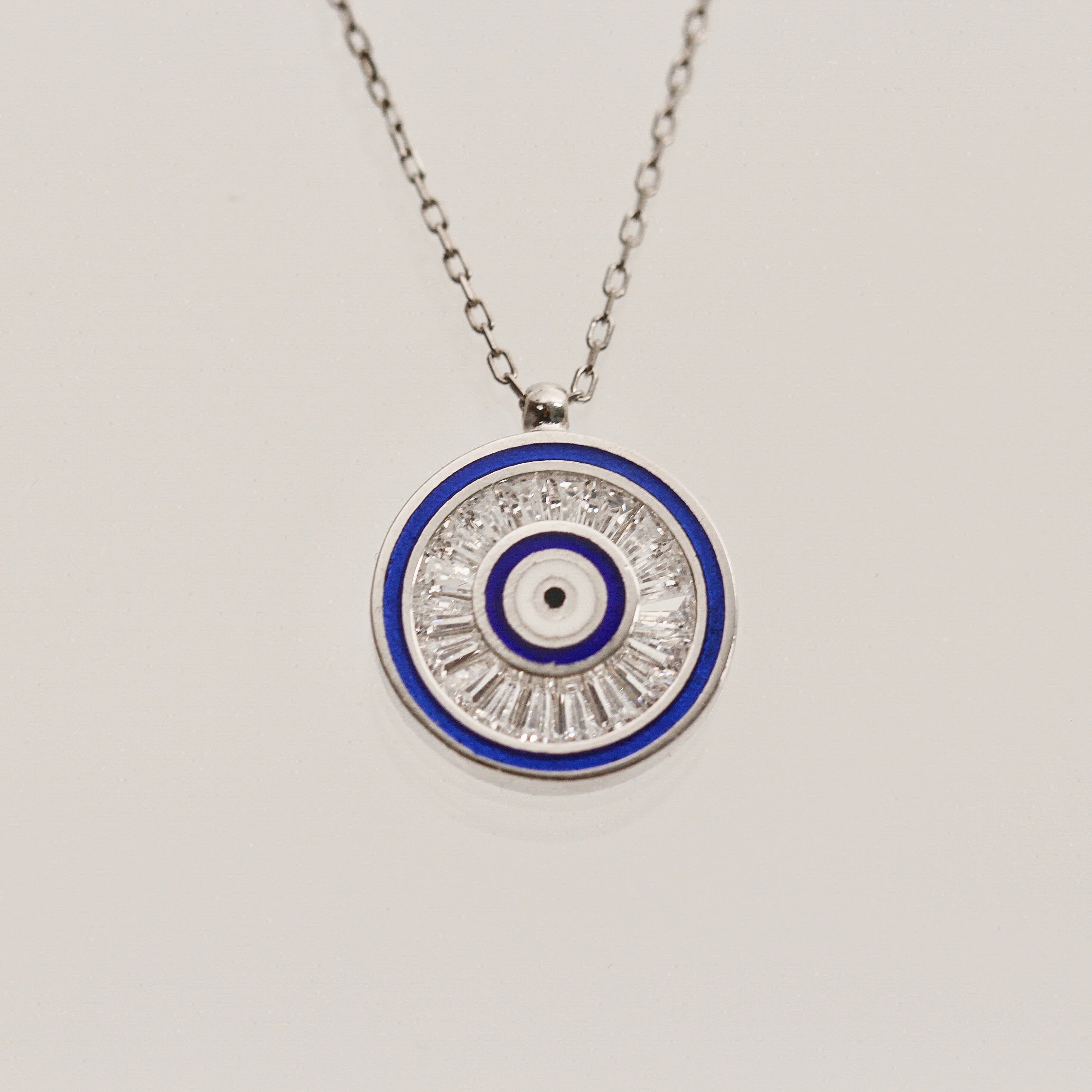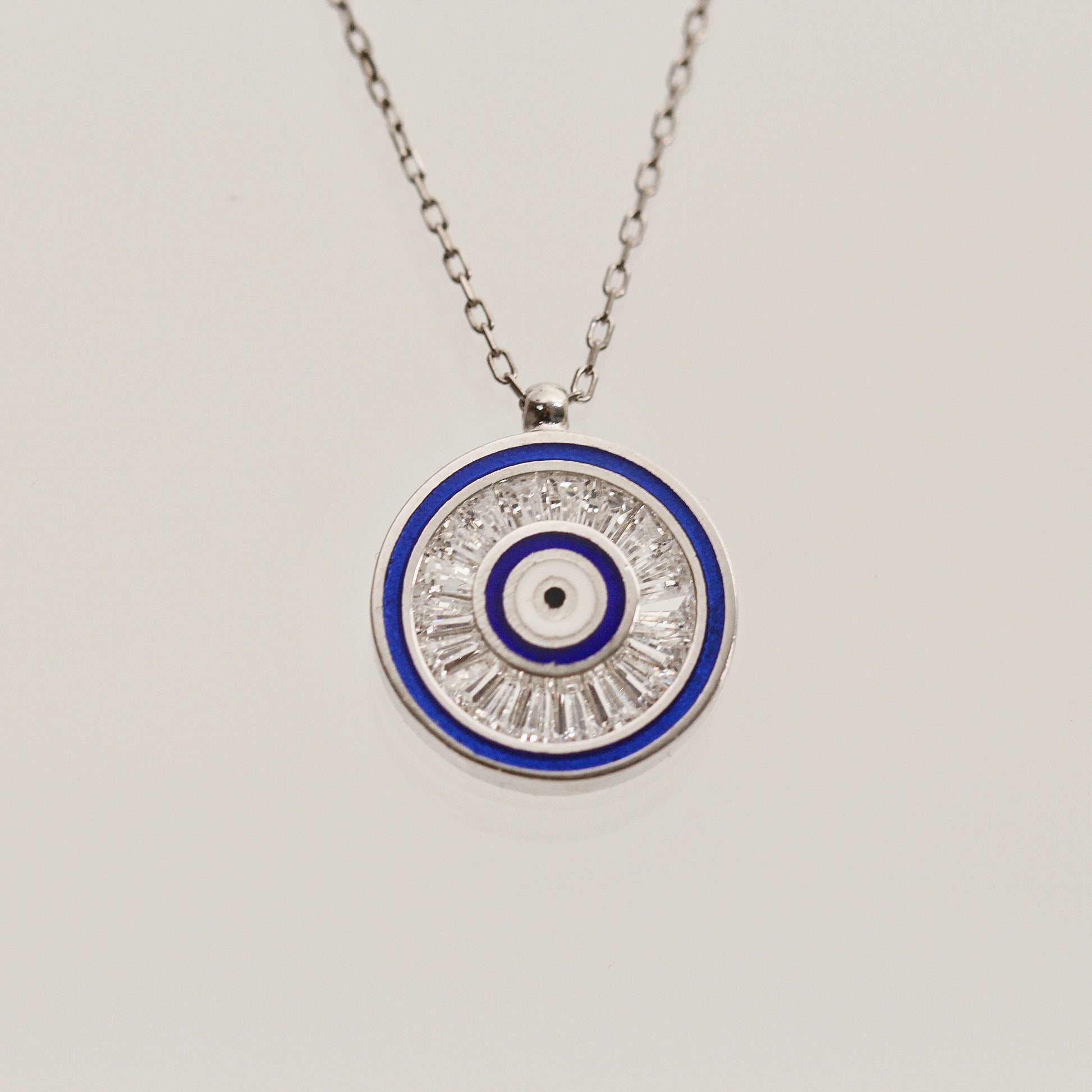 Wear the mystique of the Evil Eye, said to ward off jealousy and negative energy, with this stunning trapeze pendant necklace. Handcrafted in 14k solid gold, this necklace features a round cut gemstone that sparkles with every movement. Available in 14k yellow, rose, or white gold, it's the perfect accessory to add a touch of elegance to any outfit.