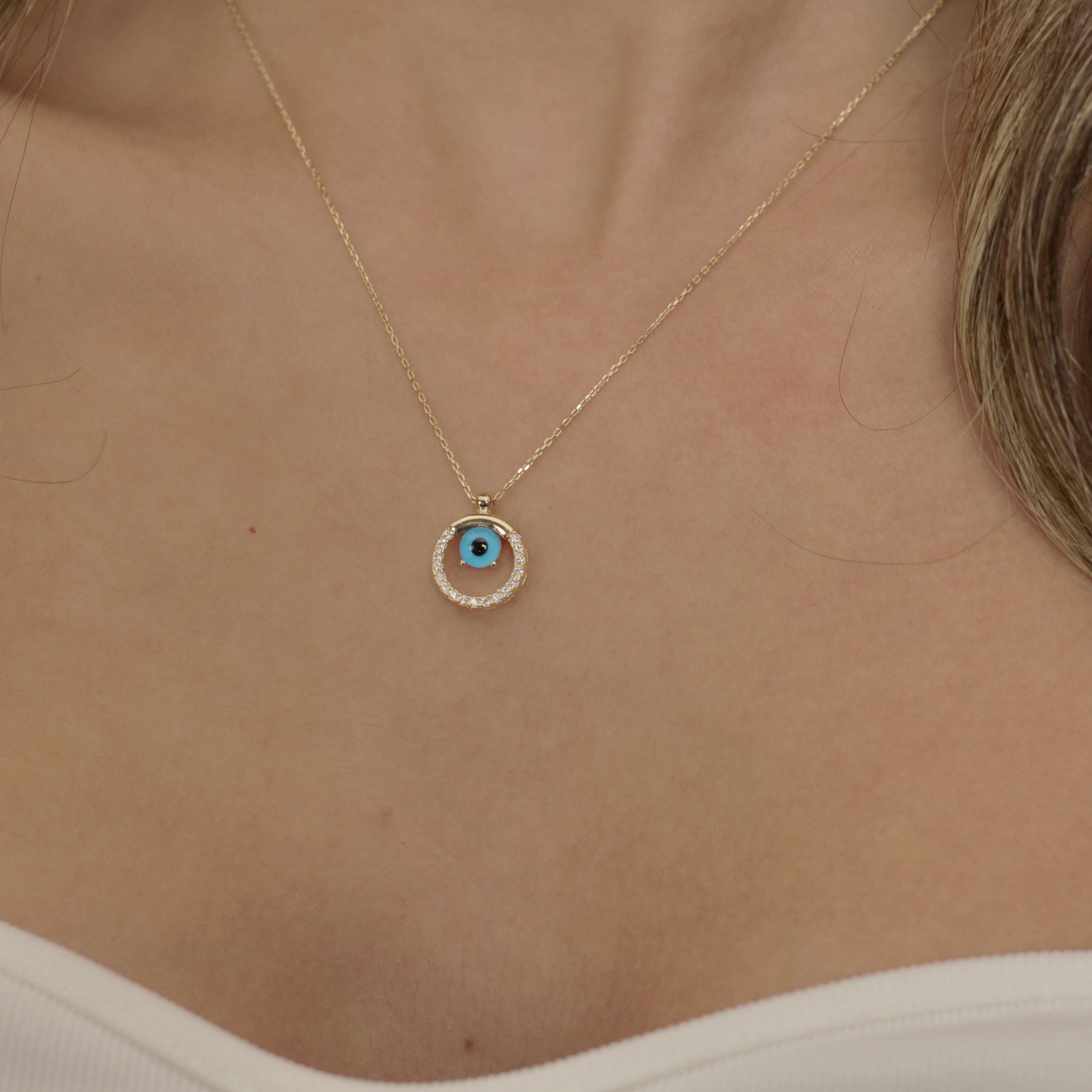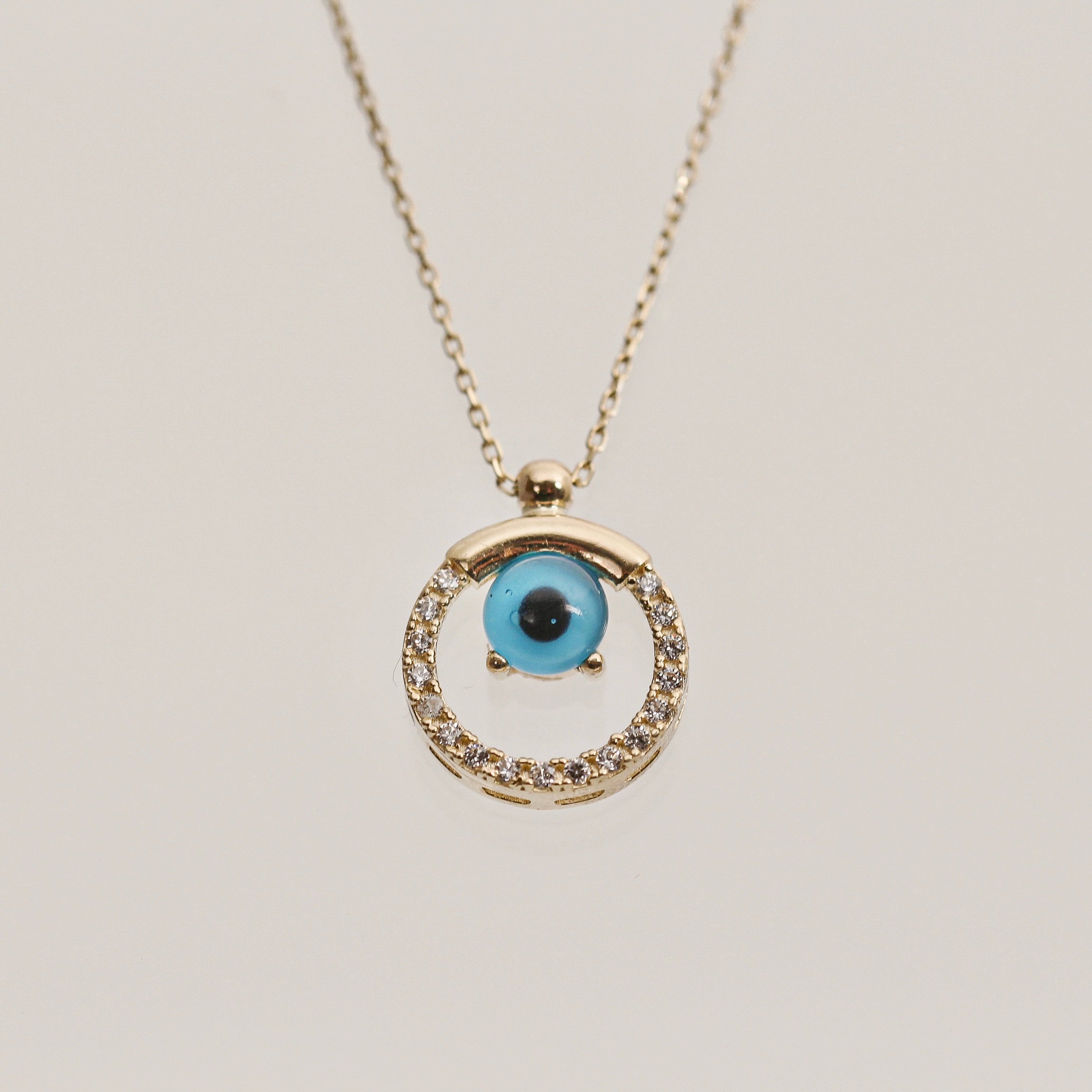 Wear the mystique of the Evil Eye, said to ward off jealousy and negative energy, with this stunning evil eye bead bagel pendant necklace. Handcrafted in 925 Sterling Silver, this necklace features a round-cut gemstone that sparkles with every movement. Available in yellow, rose, or white, it's the perfect accessory to add a touch of elegance to any outfit.
