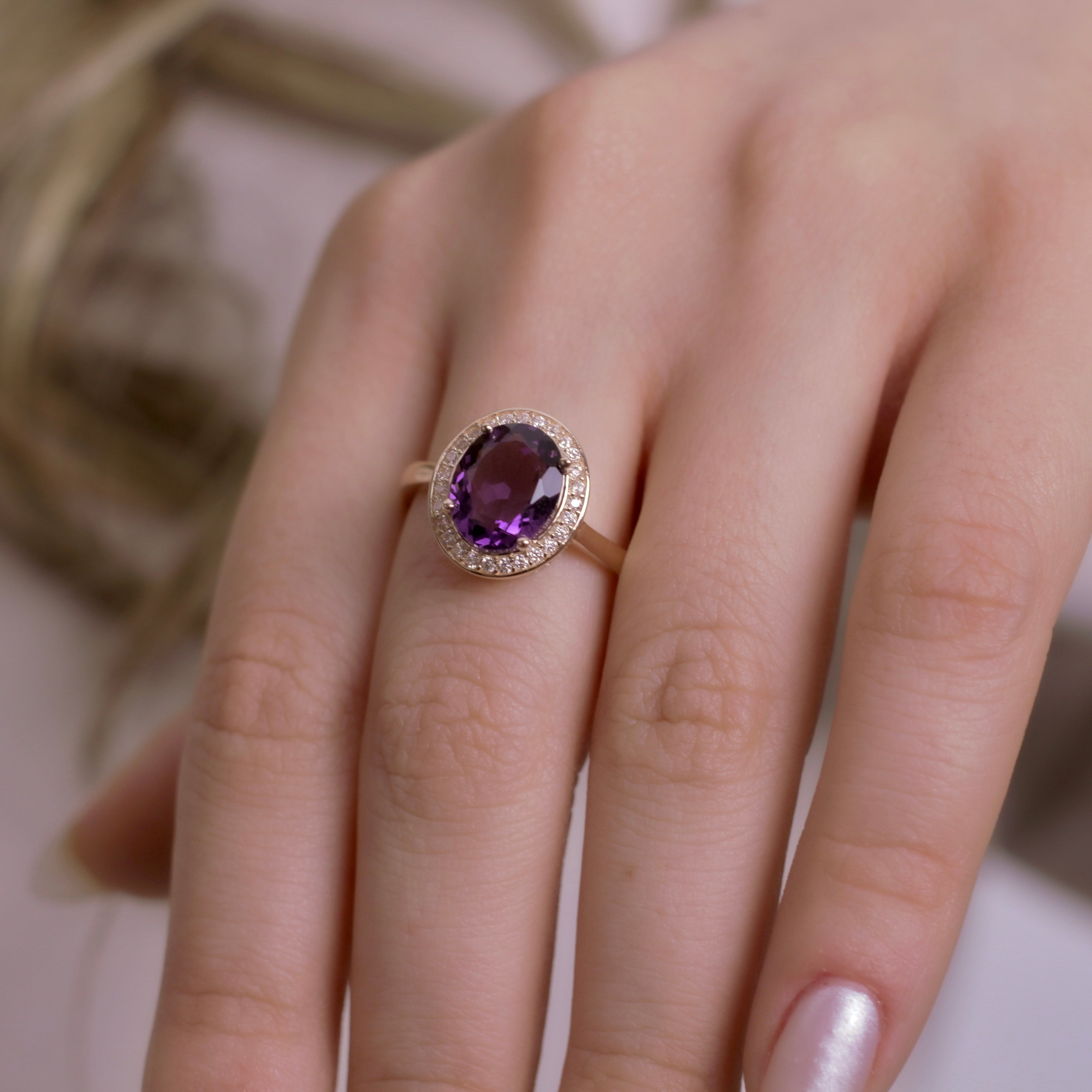 Embrace the timeless elegance of amethyst with this exquisite ring. The oval-cut amethyst, a symbol of royalty and power, shines brightly in a 925 Sterling Silver setting. Whether you prefer the warm tones of yellow gold, the romantic feel of pink gold, or the classic sophistication of white gold, this ring is a true statement piece. Indulge in the timeless beauty of amethysts with this one-of-a-kind piece of jewelry.